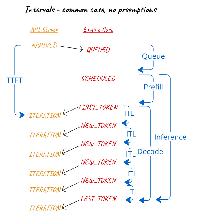 • NEW_TOKENS - when the output included in EngineCoreOutput was generated. Since this is common to all requests in a given iteration, we use a single timestamp on EngineCoreOutputs to record this event.